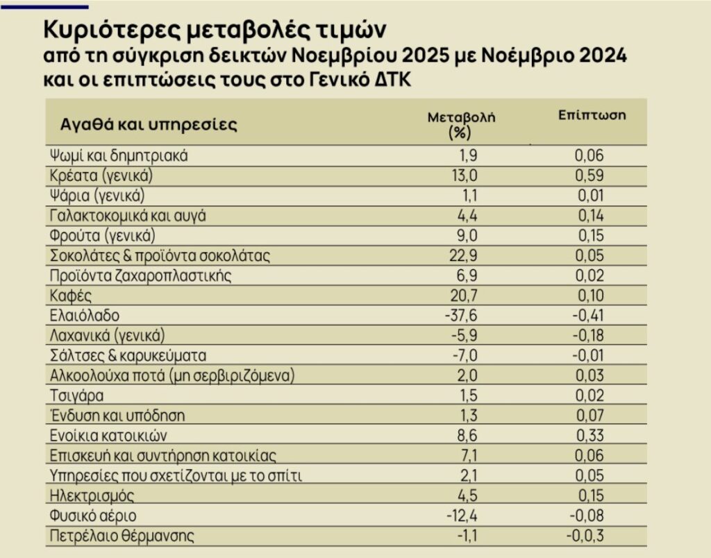 Ο πληθωρισμός στην Ελλάδα ανέβηκε στο 2,4% τον Νοέμβριο από 2,0% τον Οκτώβριο, σύμφωνα με την ΕΛΣΤΑΤ. Η μηνιαία αύξηση του Γενικού ΔΤΚ ήταν +0,1%, ενώ ο μέσος 12μήνου (Δεκέμβριος 2024 – Νοέμβριος 2025) διαμορφώθηκε στο 2,5% (από 2,8% προηγούμενο 12μηνο). Κύριοι οδηγοί: τρόφιμα +2,7%, στέγαση +3,7% και ξενοδοχεία-εστιατόρια +7,4%. «Πικρές» ανατιμήσεις σε σοκολάτα +22,9%, καφέ +20,7%, κρέατα +13%, ενοίκια +8,6%. Στον αντίποδα, ελαιόλαδο -37,6% και φυσικό αέριο -12,6%.